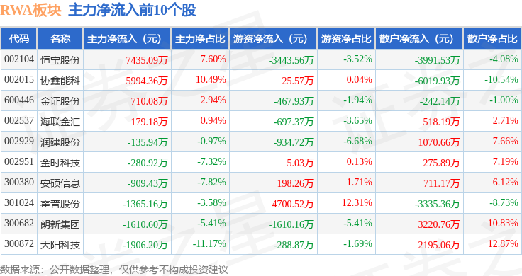 从资金流向上来看,当日RWA板块主力资金净流出1.77亿元,游资资金净流入4561.03万元,散户资金净流入1.31亿元。RWA板块个股资金流向见下表:
