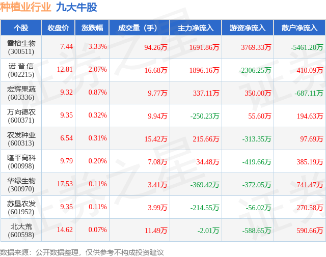 个股表现方面,种植业行业当日领涨股为雪榕生物(300511),该股当日报收7.44,上涨3.33%,成交量94.26万,主力资金净流入1691.86万元。诺 普 信(002215)以上涨2.07%紧随其后,该股当日成交量16.68万,主力资金净流入1896.16万元。除此之外,宏辉果蔬(603336)、万向德农(600371)、农发种业(600313)均进入当日牛股之列。具体个股列表见下表: