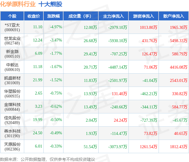 个股表现方面,化学原料行业当日领跌股为*ST亚太(000691),该股当日报收11.1,下跌4.97%,成交量12.0万,主力资金净流出2979.1万元。世龙实业(002748)以下跌3.47%紧随其后,该股当日成交量26.68万,主力资金净流出5930.1万元。除此之外,新金路(000510)、中毅达(600610)、凯盛新材(301069)均进入当日熊股之列。具体个股列表见下表: