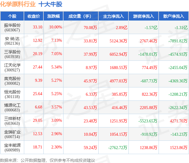 个股表现方面,化学原料行业当日领涨股为振华股份(603067),该股当日报收33.1,上涨10.0%,成交量70.08万,主力资金净流入2.89亿元。安 纳 达(002136)以上涨7.13%紧随其后,该股当日成交量33.81万,主力资金净流入5124.36万元。除此之外,三孚股份(603938)、江天化学(300927)、奥克股份(300082)均进入当日牛股之列。具体个股列表见下表: