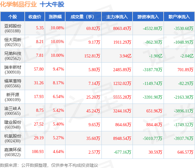 个股表现方面,化学制品行业当日领涨股为亚邦股份(603188),该股当日报收5.35,上涨10.08%,成交量69.82万,主力资金净流入8063.49万元。恒大高新(002591)以上涨10.05%紧随其后,该股当日成交量9.17万,主力资金净流入1911.29万元。除此之外,兄弟科技(002562)、瑞丰新材(300910)、福莱蒽特(605566)均进入当日牛股之列。具体个股列表见下表: