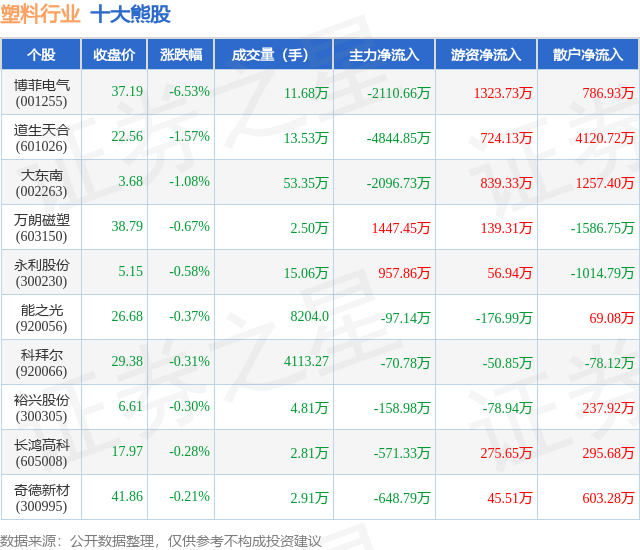 个股表现方面,塑料行业当日领跌股为博菲电气(001255),该股当日报收37.19,下跌6.53%,成交量11.68万,主力资金净流出2110.66万元。道生天合(601026)以下跌1.57%紧随其后,该股当日成交量13.53万,主力资金净流出4844.85万元。除此之外,大东南(002263)、万朗磁塑(603150)、永利股份(300230)均进入当日熊股之列。具体个股列表见下表: