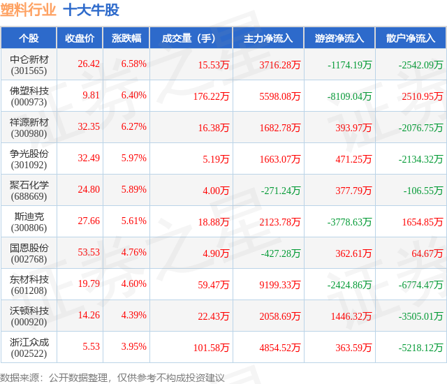 个股表现方面,塑料行业当日领涨股为中仑新材(301565),该股当日报收26.42,上涨6.58%,成交量15.53万,主力资金净流入3716.28万元。佛塑科技(000973)以上涨6.4%紧随其后,该股当日成交量176.22万,主力资金净流入5598.08万元。除此之外,祥源新材(300980)、争光股份(301092)、聚石化学(688669)均进入当日牛股之列。具体个股列表见下表: