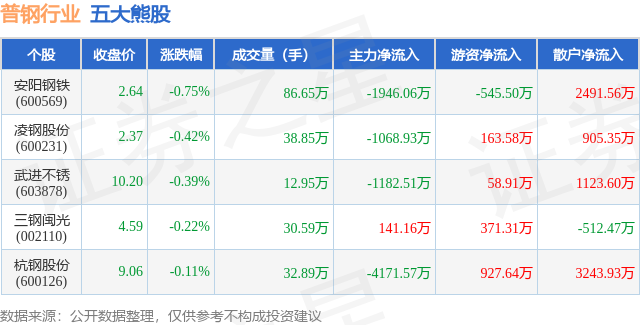 个股表现方面,普钢行业当日领跌股为安阳钢铁(600569),该股当日报收2.64,下跌0.75%,成交量86.65万,主力资金净流出1946.06万元。凌钢股份(600231)以下跌0.42%紧随其后,该股当日成交量38.85万,主力资金净流出1068.93万元。除此之外,武进不锈(603878)、三钢闽光(002110)、杭钢股份(600126)均进入当日熊股之列。具体个股列表见下表: