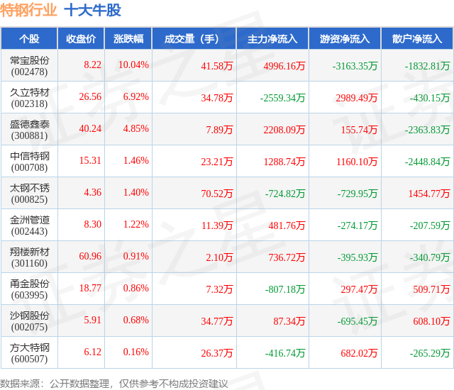 个股表现方面,特钢行业当日领涨股为常宝股份(002478),该股当日报收8.22,上涨10.04%,成交量41.58万,主力资金净流入4996.16万元。久立特材(002318)以上涨6.92%紧随其后,该股当日成交量34.78万,主力资金净流出2559.34万元。除此之外,盛德鑫泰(300881)、中信特钢(000708)、太钢不锈(000825)均进入当日牛股之列。具体个股列表见下表: