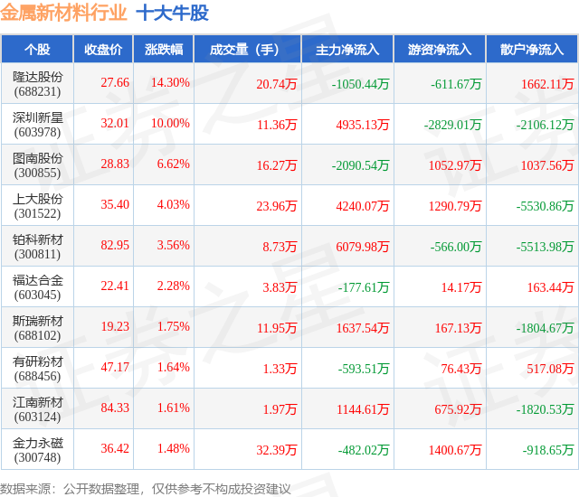 个股表现方面,金属新材料行业当日领涨股为隆达股份(688231),该股当日报收27.66,上涨14.3%,成交量20.74万,主力资金净流出1050.44万元。深圳新星(603978)以上涨10.0%紧随其后,该股当日成交量11.36万,主力资金净流入4935.13万元。除此之外,图南股份(300855)、上大股份(301522)、铂科新材(300811)均进入当日牛股之列。具体个股列表见下表: