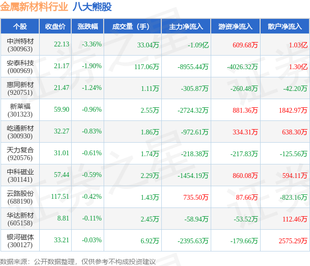 个股表现方面,金属新材料行业当日领跌股为中洲特材(300963),该股当日报收22.13,下跌3.36%,成交量33.04万,主力资金净流出1.09亿元。安泰科技(000969)以下跌1.9%紧随其后,该股当日成交量117.06万,主力资金净流出8955.44万元。除此之外,惠同新材(920751)、新莱福(301323)、屹通新材(300930)均进入当日熊股之列。具体个股列表见下表: