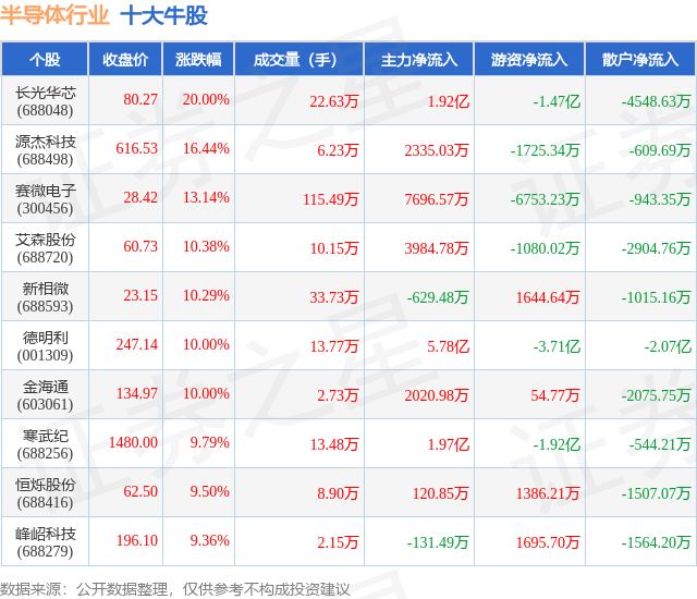 个股表现方面,半导体行业当日领涨股为长光华芯(688048),该股当日报收80.27,上涨20.0%,成交量22.63万,主力资金净流入1.92亿元。源杰科技(688498)以上涨16.44%紧随其后,该股当日成交量6.23万,主力资金净流入2335.03万元。除此之外,赛微电子(300456)、艾森股份(688720)、新相微(688593)均进入当日牛股之列。具体个股列表见下表: