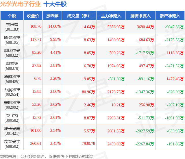 个股表现方面,光学光电子行业当日领涨股为东田微(301183),该股当日报收108.7,上涨14.0%,成交量14.64万,主力资金净流入5356.95万元。腾景科技(688195)以上涨9.95%紧随其后,该股当日成交量8.63万,主力资金净流入1490.95万元。除此之外,奥比中光(688322)、奥来德(688378)、清越科技(688496)均进入当日牛股之列。具体个股列表见下表: