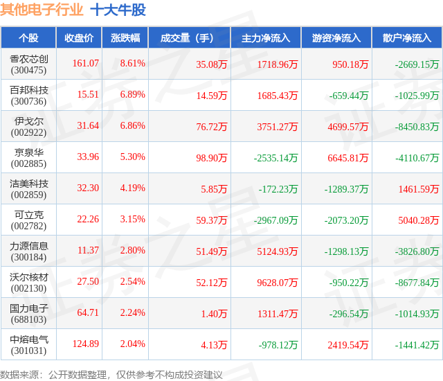 个股表现方面,其他电子行业当日领涨股为香农芯创(300475),该股当日报收161.07,上涨8.61%,成交量35.08万,主力资金净流入1718.96万元。百邦科技(300736)以上涨6.89%紧随其后,该股当日成交量14.59万,主力资金净流入1685.43万元。除此之外,伊戈尔(002922)、京泉华(002885)、洁美科技(002859)均进入当日牛股之列。具体个股列表见下表: