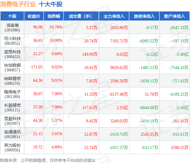 个股表现方面,消费电子行业当日领涨股为鸿富瀚(301086),该股当日报收96.0,上涨10.7%,成交量5.27万,主力资金净流入2655.8万元。可川科技(603052)以上涨10.0%紧随其后,该股当日成交量20.74万,主力资金净流入7192.71万元。除此之外,蓝思科技(300433)、协创数据(300857)、统联精密(688210)均进入当日牛股之列。具体个股列表见下表: