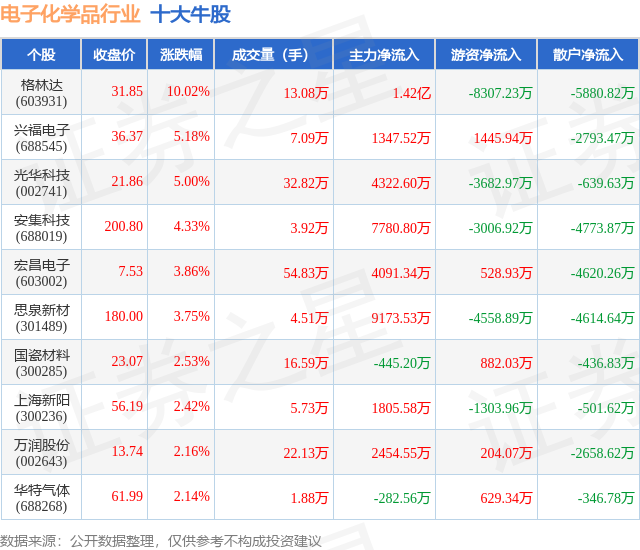 个股表现方面,电子化学品行业当日领涨股为格林达(603931),该股当日报收31.85,上涨10.02%,成交量13.08万,主力资金净流入1.42亿元。兴福电子(688545)以上涨5.18%紧随其后,该股当日成交量7.09万,主力资金净流入1347.52万元。除此之外,光华科技(002741)、安集科技(688019)、宏昌电子(603002)均进入当日牛股之列。具体个股列表见下表: