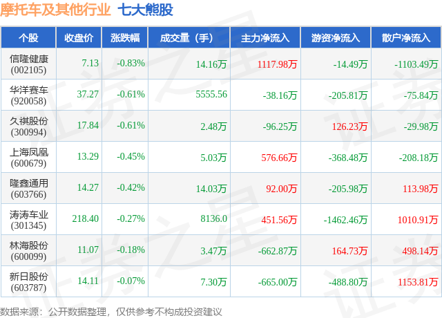 个股表现方面,摩托车及其他行业当日领跌股为信隆健康(002105),该股当日报收7.13,下跌0.83%,成交量14.16万,主力资金净流入1117.98万元。华洋赛车(920058)以下跌0.61%紧随其后,该股当日成交量5556.0,主力资金净流出38.16万元。除此之外,久祺股份(300994)、上海凤凰(600679)、隆鑫通用(603766)均进入当日熊股之列。具体个股列表见下表: