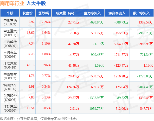 个股表现方面,商用车行业当日领涨股为中集车辆(301039),该股当日报收9.97,上涨2.26%,成交量22.71万,主力资金净流出620.84万元。中国重汽(000951)以上涨1.64%紧随其后,该股当日成交量17.5万,主力资金净流入507.77万元。除此之外,一汽解放(000800)、宇通客车(600066)、江淮汽车(600418)均进入当日牛股之列。具体个股列表见下表: