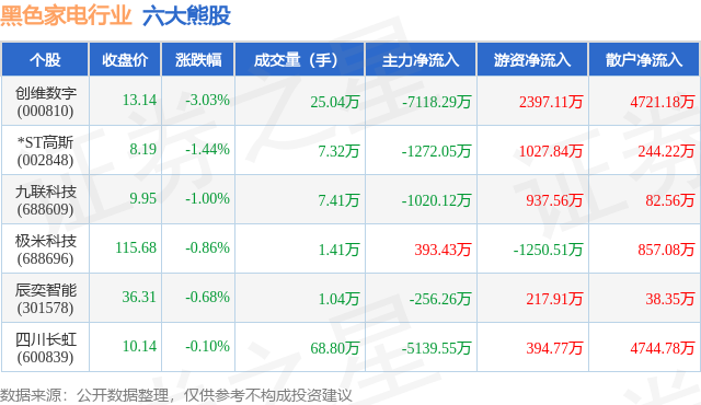 个股表现方面,黑色家电行业当日领跌股为创维数字(000810),该股当日报收13.14,下跌3.03%,成交量25.04万,主力资金净流出7118.29万元。*ST高斯(002848)以下跌1.44%紧随其后,该股当日成交量7.32万,主力资金净流出1272.05万元。除此之外,九联科技(688609)、极米科技(688696)、辰奕智能(301578)均进入当日熊股之列。具体个股列表见下表: