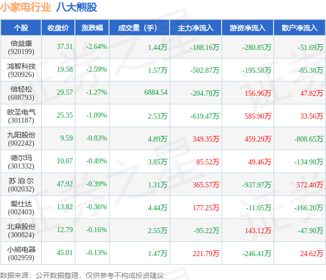 个股表现方面,小家电行业当日领跌股为倍益康(920199),该股当日报收37.31,下跌2.64%,成交量1.44万,主力资金净流出188.16万元。鸿智科技(920926)以下跌2.59%紧随其后,该股当日成交量1.57万,主力资金净流出502.87万元。除此之外,倍轻松(688793)、欧圣电气(301187)、九阳股份(002242)均进入当日熊股之列。具体个股列表见下表: