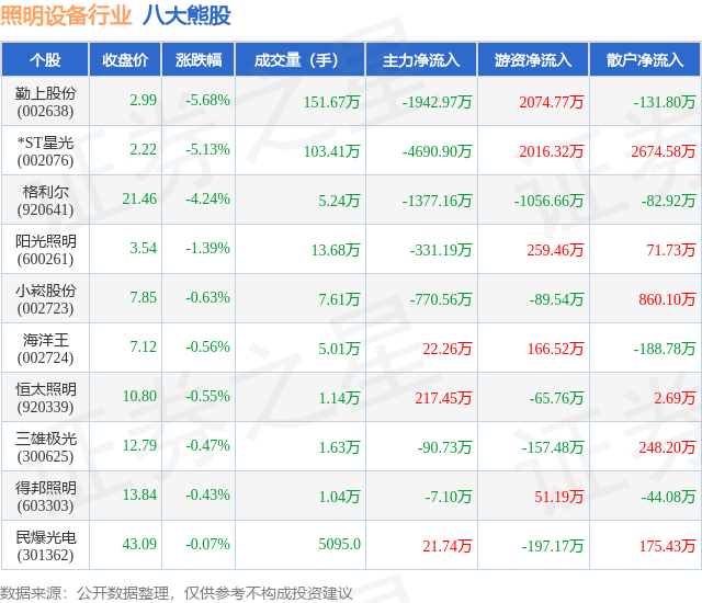 个股表现方面,照明设备行业当日领跌股为勤上股份(002638),该股当日报收2.99,下跌5.68%,成交量151.67万,主力资金净流出1942.97万元。*ST星光(002076)以下跌5.13%紧随其后,该股当日成交量103.41万,主力资金净流出4690.9万元。除此之外,格利尔(920641)、阳光照明(600261)、小崧股份(002723)均进入当日熊股之列。具体个股列表见下表: