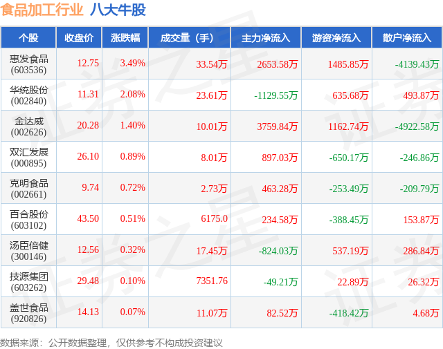 个股表现方面,食品加工行业当日领涨股为惠发食品(603536),该股当日报收12.75,上涨3.49%,成交量33.54万,主力资金净流入2653.58万元。华统股份(002840)以上涨2.08%紧随其后,该股当日成交量23.61万,主力资金净流出1129.55万元。除此之外,金达威(002626)、双汇发展(000895)、克明食品(002661)均进入当日牛股之列。具体个股列表见下表: