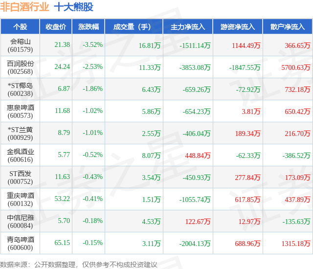 个股表现方面,非白酒行业当日领跌股为会稽山(601579),该股当日报收21.38,下跌3.52%,成交量16.81万,主力资金净流出1511.14万元。百润股份(002568)以下跌2.53%紧随其后,该股当日成交量11.33万,主力资金净流出3853.08万元。除此之外,*ST椰岛(600238)、惠泉啤酒(600573)、*ST兰黄(000929)均进入当日熊股之列。具体个股列表见下表: