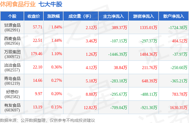 个股表现方面,休闲食品行业当日领涨股为甘源食品(002991),该股当日报收57.71,上涨1.84%,成交量2.12万,主力资金净流入389.37万元。西麦食品(002956)以上涨1.44%紧随其后,该股当日成交量3.46万,主力资金净流出107.15万元。除此之外,万辰集团(300972)、洽洽食品(002557)、青岛食品(001219)均进入当日牛股之列。具体个股列表见下表: