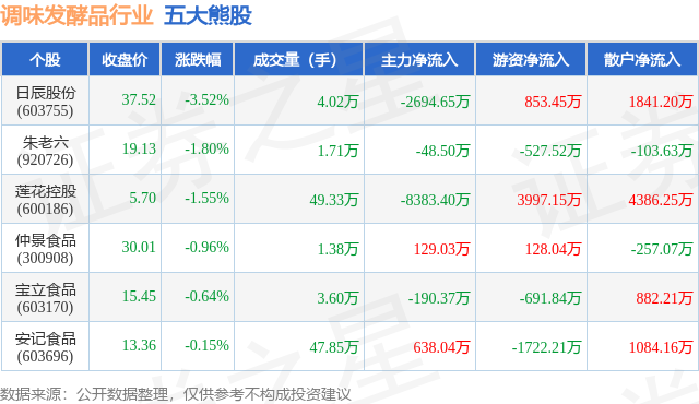 个股表现方面,调味发酵品行业当日领跌股为日辰股份(603755),该股当日报收37.52,下跌3.52%,成交量4.02万,主力资金净流出2694.65万元。朱老六(920726)以下跌1.8%紧随其后,该股当日成交量1.71万,主力资金净流出48.5万元。除此之外,莲花控股(600186)、仲景食品(300908)、宝立食品(603170)均进入当日熊股之列。具体个股列表见下表: