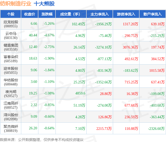 个股表现方面,纺织制造行业当日领跌股为欣龙控股(000955),该股当日报收6.66,下跌5.26%,成交量102.49万,主力资金净流出1956.29万元。云中马(603130)以下跌4.67%紧随其后,该股当日成交量4.96万,主力资金净流出75.46万元。除此之外,健盛集团(603558)、富春染织(605189)、迎丰股份(605055)均进入当日熊股之列。具体个股列表见下表: