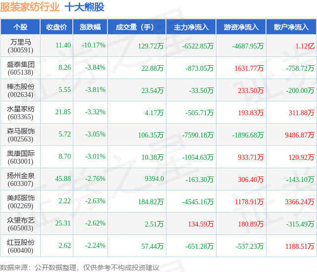 个股表现方面,服装家纺行业当日领跌股为万里马(300591),该股当日报收11.4,下跌10.17%,成交量129.72万,主力资金净流出6522.85万元。盛泰集团(605138)以下跌3.84%紧随其后,该股当日成交量22.88万,主力资金净流出873.05万元。除此之外,棒杰股份(002634)、水星家纺(603365)、森马服饰(002563)均进入当日熊股之列。具体个股列表见下表: