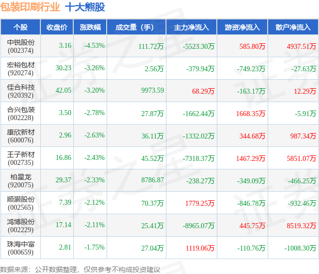 个股表现方面,包装印刷行业当日领跌股为中锐股份(002374),该股当日报收3.16,下跌4.53%,成交量111.72万,主力资金净流出5523.3万元。宏裕包材(920274)以下跌3.26%紧随其后,该股当日成交量2.56万,主力资金净流出379.94万元。除此之外,佳合科技(920392)、合兴包装(002228)、康欣新材(600076)均进入当日熊股之列。具体个股列表见下表: