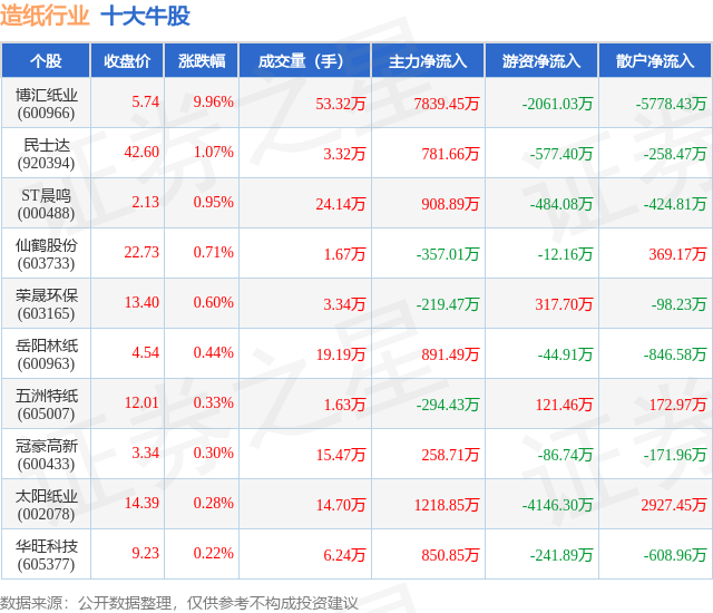 个股表现方面,造纸行业当日领涨股为博汇纸业(600966),该股当日报收5.74,上涨9.96%,成交量53.32万,主力资金净流入7839.45万元。民士达(920394)以上涨1.07%紧随其后,该股当日成交量3.32万,主力资金净流入781.66万元。除此之外,ST晨鸣(000488)、仙鹤股份(603733)、荣晟环保(603165)均进入当日牛股之列。具体个股列表见下表:
