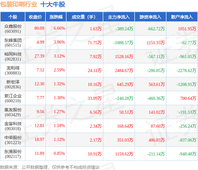 个股表现方面,包装印刷行业当日领涨股为众鑫股份(603091),该股当日报收80.09,上涨6.66%,成交量1.63万,主力资金净流出389.24万元。东峰集团(601515)以上涨3.96%紧随其后,该股当日成交量71.75万,主力资金净流出1088.57万元。除此之外,裕同科技(002831)、龙利得(300883)、新宏泽(002836)均进入当日牛股之列。具体个股列表见下表: