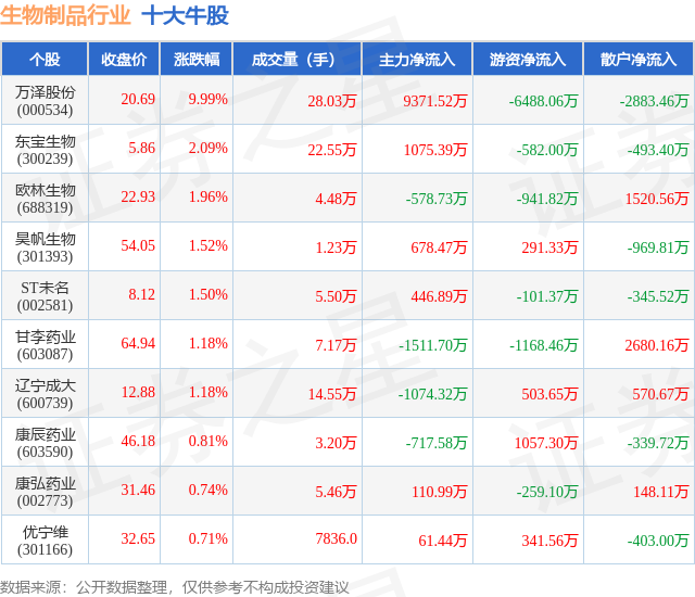 个股表现方面,生物制品行业当日领涨股为万泽股份(000534),该股当日报收20.69,上涨9.99%,成交量28.03万,主力资金净流入9371.52万元。东宝生物(300239)以上涨2.09%紧随其后,该股当日成交量22.55万,主力资金净流入1075.39万元。除此之外,欧林生物(688319)、昊帆生物(301393)、ST未名(002581)均进入当日牛股之列。具体个股列表见下表: