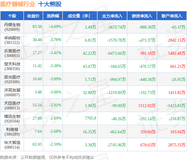 个股表现方面,医疗器械行业当日领跌股为丹娜生物(920009),该股当日报收83.5,下跌4.69%,成交量2.49万,主力资金净流出3672.74万元。采纳股份(301122)以下跌3.76%紧随其后,该股当日成交量6.81万,主力资金净流出1570.78万元。除此之外,乐普医疗(300003)、楚天科技(300358)、辰光医疗(920300)均进入当日熊股之列。具体个股列表见下表: