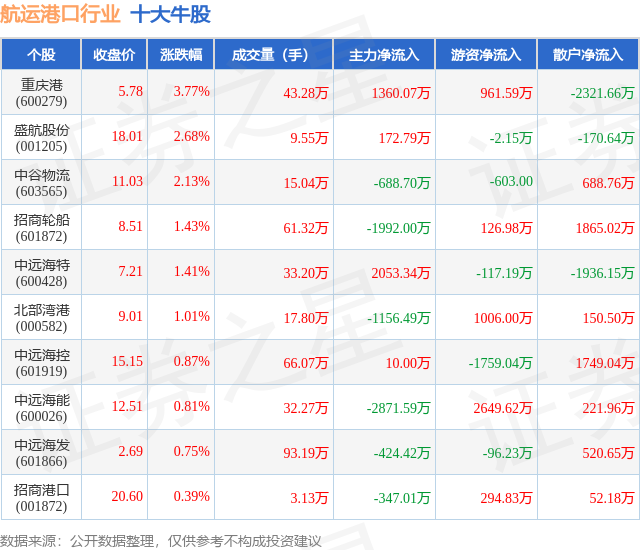 个股表现方面,航运港口行业当日领涨股为重庆港(600279),该股当日报收5.78,上涨3.77%,成交量43.28万,主力资金净流入1360.07万元。盛航股份(001205)以上涨2.68%紧随其后,该股当日成交量9.55万,主力资金净流入172.79万元。除此之外,中谷物流(603565)、招商轮船(601872)、中远海特(600428)均进入当日牛股之列。具体个股列表见下表: