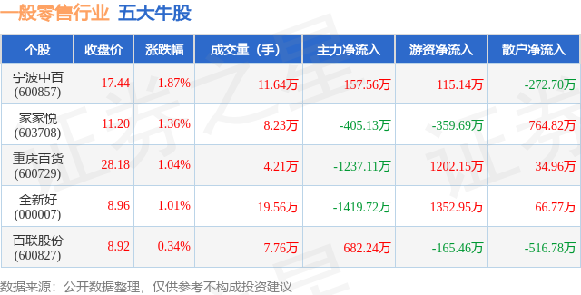 个股表现方面,一般零售行业当日领涨股为宁波中百(600857),该股当日报收17.44,上涨1.87%,成交量11.64万,主力资金净流入157.56万元。家家悦(603708)以上涨1.36%紧随其后,该股当日成交量8.23万,主力资金净流出405.13万元。除此之外,重庆百货(600729)、全新好(000007)、百联股份(600827)均进入当日牛股之列。具体个股列表见下表: