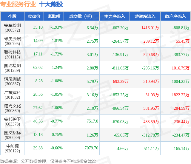 个股表现方面,专业服务行业当日领跌股为安车检测(300572),该股当日报收35.1,下跌1.93%,成交量6.34万,主力资金净流出607.2万元。米奥会展(300795)以下跌1.81%紧随其后,该股当日成交量2.75万,主力资金净流出264.57万元。除此之外,联检科技(301115)、国缆检测(301289)、谱尼测试(300887)均进入当日熊股之列。具体个股列表见下表: