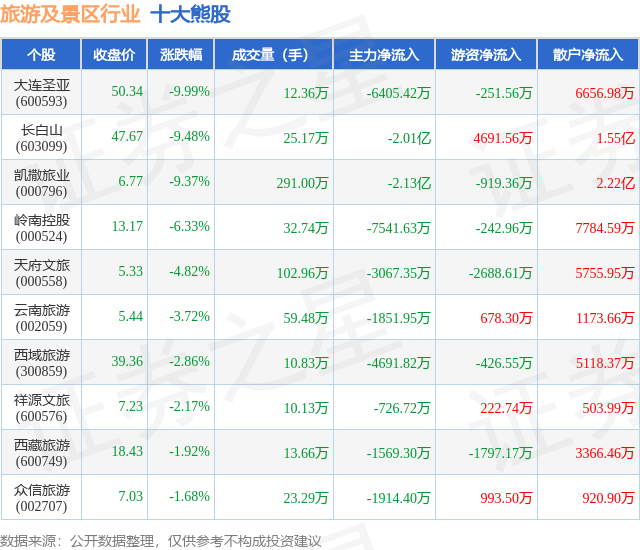 个股表现方面,旅游及景区行业当日领跌股为大连圣亚(600593),该股当日报收50.34,下跌9.99%,成交量12.36万,主力资金净流出6405.42万元。长白山(603099)以下跌9.48%紧随其后,该股当日成交量25.17万,主力资金净流出2.01亿元。除此之外,凯撒旅业(000796)、岭南控股(000524)、天府文旅(000558)均进入当日熊股之列。具体个股列表见下表: