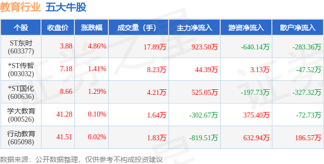 个股表现方面,教育行业当日领涨股为ST东时(603377),该股当日报收3.88,上涨4.86%,成交量17.89万,主力资金净流入923.5万元。*ST传智(003032)以上涨1.41%紧随其后,该股当日成交量8.23万,主力资金净流入44.39万元。除此之外,*ST国化(600636)、学大教育(000526)、行动教育(605098)均进入当日牛股之列。具体个股列表见下表:
