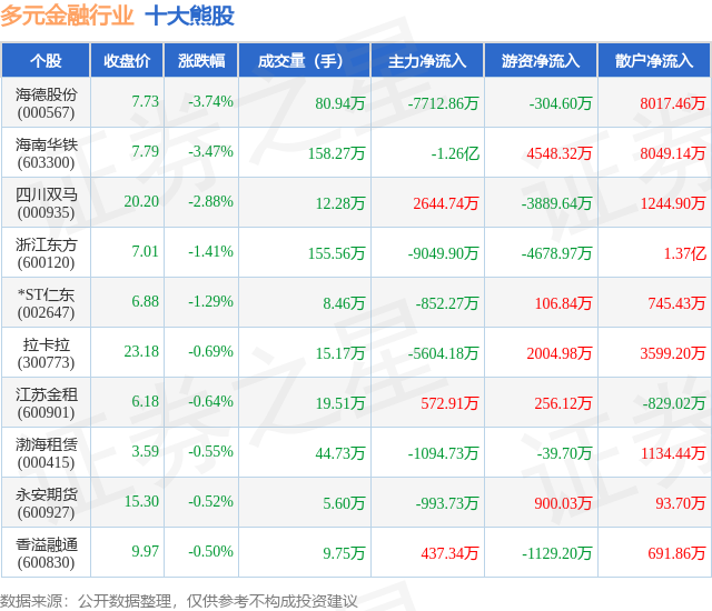 个股表现方面,多元金融行业当日领跌股为海德股份(000567),该股当日报收7.73,下跌3.74%,成交量80.94万,主力资金净流出7712.86万元。海南华铁(603300)以下跌3.47%紧随其后,该股当日成交量158.27万,主力资金净流出1.26亿元。除此之外,四川双马(000935)、浙江东方(600120)、*ST仁东(002647)均进入当日熊股之列。具体个股列表见下表: