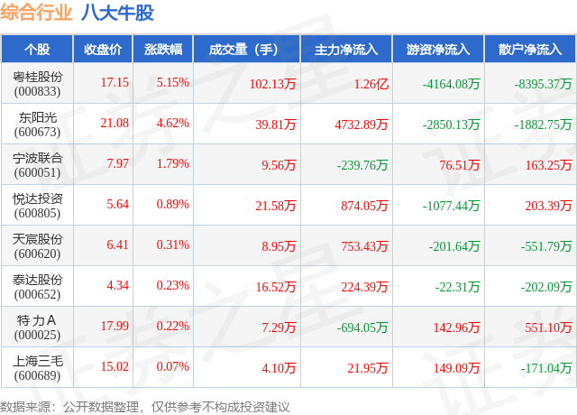 个股表现方面,综合行业当日领涨股为粤桂股份(000833),该股当日报收17.15,上涨5.15%,成交量102.13万,主力资金净流入1.26亿元。东阳光(600673)以上涨4.62%紧随其后,该股当日成交量39.81万,主力资金净流入4732.89万元。除此之外,宁波联合(600051)、悦达投资(600805)、天宸股份(600620)均进入当日牛股之列。具体个股列表见下表: