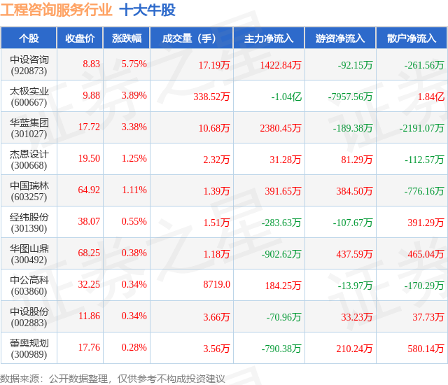 个股表现方面,工程咨询服务行业当日领涨股为中设咨询(920873),该股当日报收8.83,上涨5.75%,成交量17.19万,主力资金净流入1422.84万元。太极实业(600667)以上涨3.89%紧随其后,该股当日成交量338.52万,主力资金净流出1.04亿元。除此之外,华蓝集团(301027)、杰恩设计(300668)、中国瑞林(603257)均进入当日牛股之列。具体个股列表见下表: