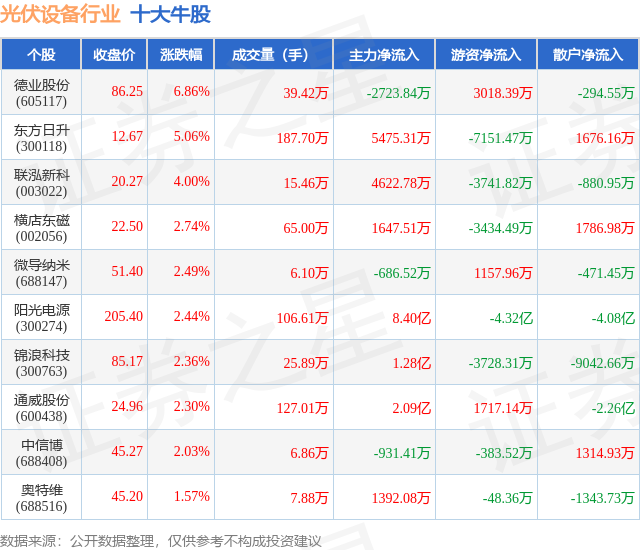 个股表现方面,光伏设备行业当日领涨股为德业股份(605117),该股当日报收86.25,上涨6.86%,成交量39.42万,主力资金净流出2723.84万元。东方日升(300118)以上涨5.06%紧随其后,该股当日成交量187.7万,主力资金净流入5475.31万元。除此之外,联泓新科(003022)、横店东磁(002056)、微导纳米(688147)均进入当日牛股之列。具体个股列表见下表: