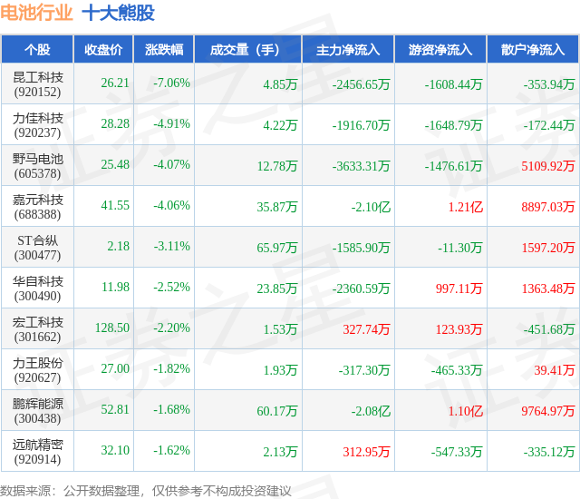 个股表现方面,电池行业当日领跌股为昆工科技(920152),该股当日报收26.21,下跌7.06%,成交量4.85万,主力资金净流出2456.65万元。力佳科技(920237)以下跌4.91%紧随其后,该股当日成交量4.22万,主力资金净流出1916.7万元。除此之外,野马电池(605378)、嘉元科技(688388)、ST合纵(300477)均进入当日熊股之列。具体个股列表见下表: