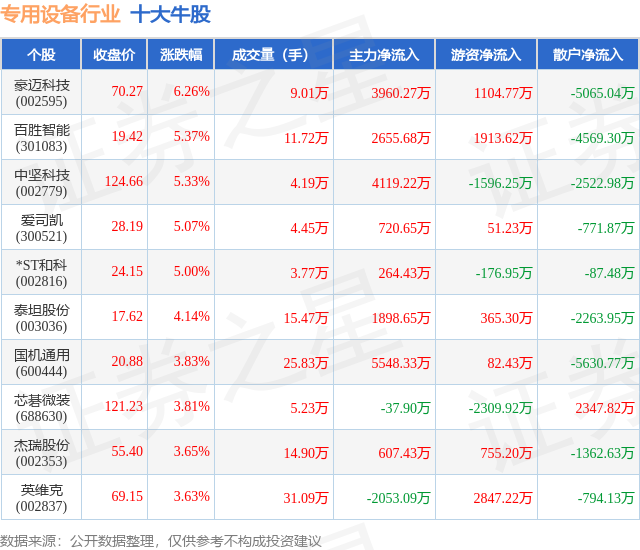 个股表现方面,专用设备行业当日领涨股为豪迈科技(002595),该股当日报收70.27,上涨6.26%,成交量9.01万,主力资金净流入3960.27万元。百胜智能(301083)以上涨5.37%紧随其后,该股当日成交量11.72万,主力资金净流入2655.68万元。除此之外,中坚科技(002779)、爱司凯(300521)、*ST和科(002816)均进入当日牛股之列。具体个股列表见下表: