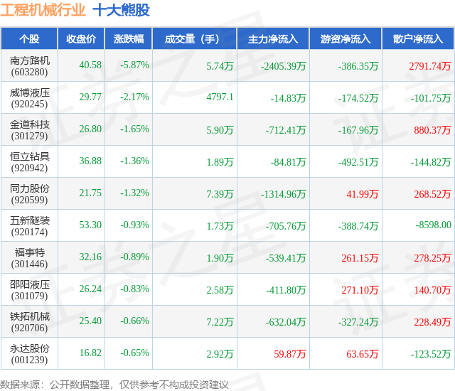 个股表现方面,工程机械行业当日领跌股为南方路机(603280),该股当日报收40.58,下跌5.87%,成交量5.74万,主力资金净流出2405.39万元。威博液压(920245)以下跌2.17%紧随其后,该股当日成交量4797.0,主力资金净流出14.83万元。除此之外,金道科技(301279)、恒立钻具(920942)、同力股份(920599)均进入当日熊股之列。具体个股列表见下表: