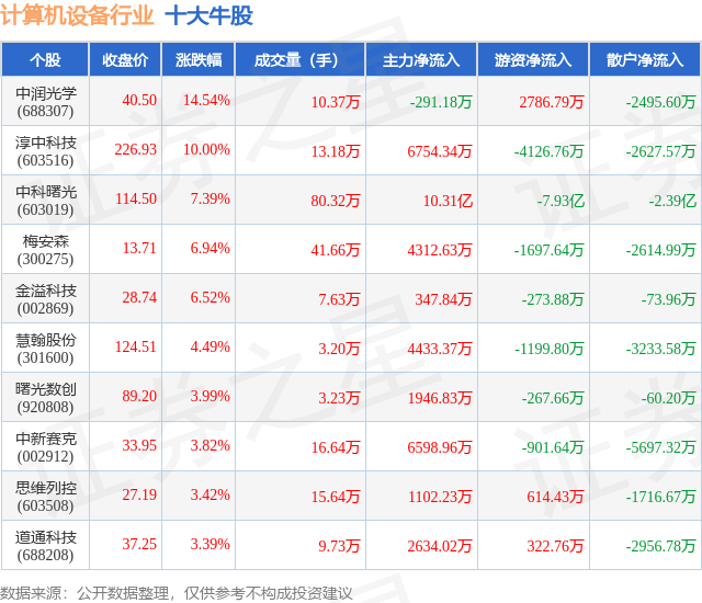 个股表现方面,计算机设备行业当日领涨股为中润光学(688307),该股当日报收40.5,上涨14.54%,成交量10.37万,主力资金净流出291.18万元。淳中科技(603516)以上涨10.0%紧随其后,该股当日成交量13.18万,主力资金净流入6754.34万元。除此之外,中科曙光(603019)、梅安森(300275)、金溢科技(002869)均进入当日牛股之列。具体个股列表见下表: