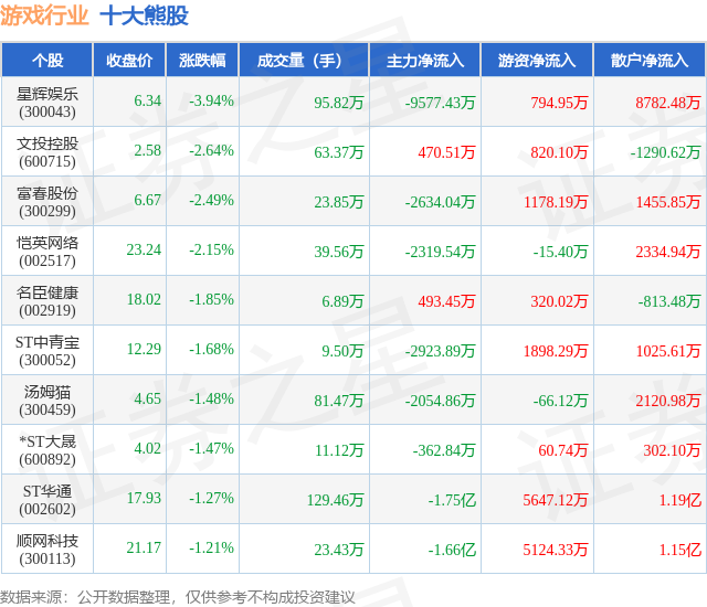 个股表现方面,游戏行业当日领跌股为星辉娱乐(300043),该股当日报收6.34,下跌3.94%,成交量95.82万,主力资金净流出9577.43万元。文投控股(600715)以下跌2.64%紧随其后,该股当日成交量63.37万,主力资金净流入470.51万元。除此之外,富春股份(300299)、恺英网络(002517)、名臣健康(002919)均进入当日熊股之列。具体个股列表见下表: