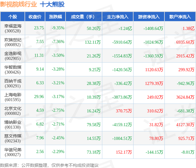 个股表现方面,影视院线行业当日领跌股为幸福蓝海(300528),该股当日报收23.75,下跌9.35%,成交量50.2万,主力资金净流出1.24亿元。欢瑞世纪(000892)以下跌7.36%紧随其后,该股当日成交量132.11万,主力资金净流出5910.64万元。除此之外,金逸影视(002905)、华智数媒(300426)、百纳千成(300291)均进入当日熊股之列。具体个股列表见下表: