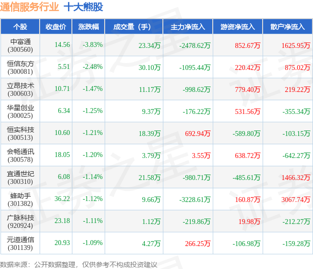 个股表现方面,通信服务行业当日领跌股为中富通(300560),该股当日报收14.56,下跌3.83%,成交量23.34万,主力资金净流出2478.62万元。恒信东方(300081)以下跌2.48%紧随其后,该股当日成交量30.1万,主力资金净流出1095.44万元。除此之外,立昂技术(300603)、华星创业(300025)、恒实科技(300513)均进入当日熊股之列。具体个股列表见下表: