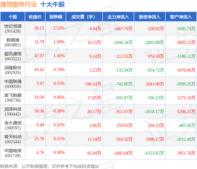 个股表现方面,通信服务行业当日领涨股为世纪恒通(301428),该股当日报收36.15,上涨2.52%,成交量4.94万,主力资金净流入1467.7万元。数据港(603881)以上涨1.5%紧随其后,该股当日成交量16.33万,主力资金净流出1690.34万元。除此之外,超讯通信(603322)、润建股份(002929)、中国联通(600050)均进入当日牛股之列。具体个股列表见下表:
