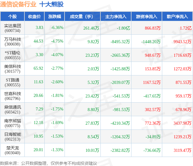 个股表现方面,通信设备行业当日领跌股为实达集团(600734),该股当日报收3.83,下跌6.36%,成交量261.46万,主力资金净流出1.8亿元。万马科技(300698)以下跌4.75%紧随其后,该股当日成交量9.82万,主力资金净流出8495.32万元。除此之外,*ST精伦(600355)、美信科技(301577)、ST路通(300555)均进入当日熊股之列。具体个股列表见下表: